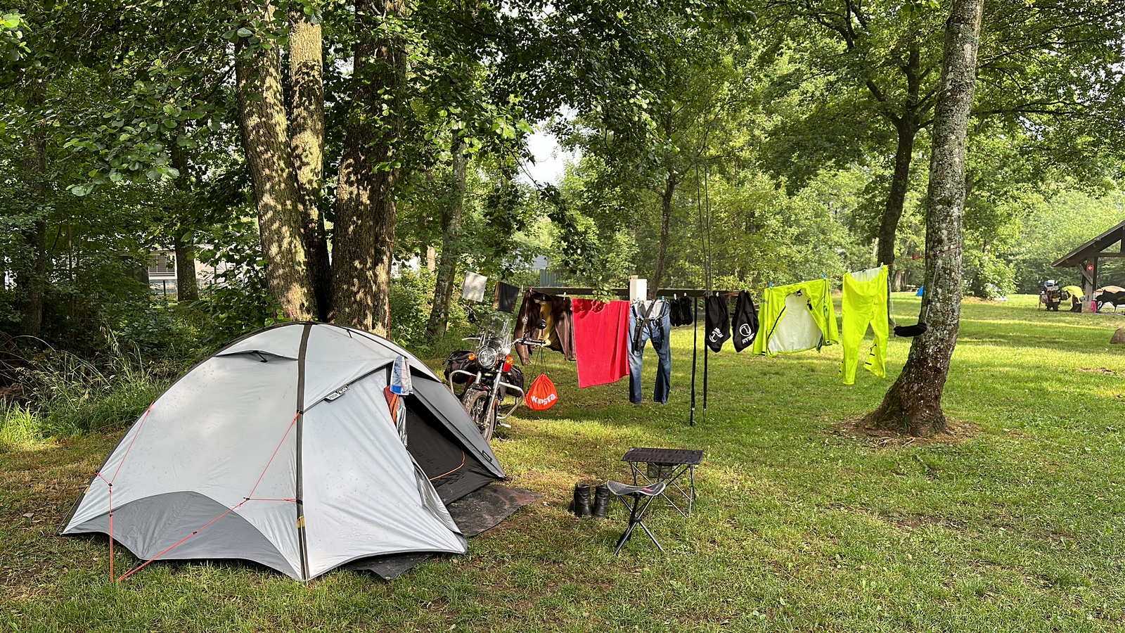 5h30 réveillé, hé oui c’est tôt, mais mon matelas est crevé j’ai dormis tant bien que mal mais dormi. Le jour se lève et je ne perds pas de temps je mets à sécher tout mon bazar.Objectif trouver un matelas, Jean François un ami, local, ayant lu mes péripéties sur Facebook m’indique un décathlon à 20km. Me voilà sauvé…Saint Décat priez pour nous! (St Décat est le Saint patron des Kayakistes et motards sur la route, si si c’est vrai il m’a sauvé souvent la mise) Après quelques discussions avec des motards arrivés aussi dans la nuit,Anglais et Français, je pars chercher le graal pour mes nuits à venir…