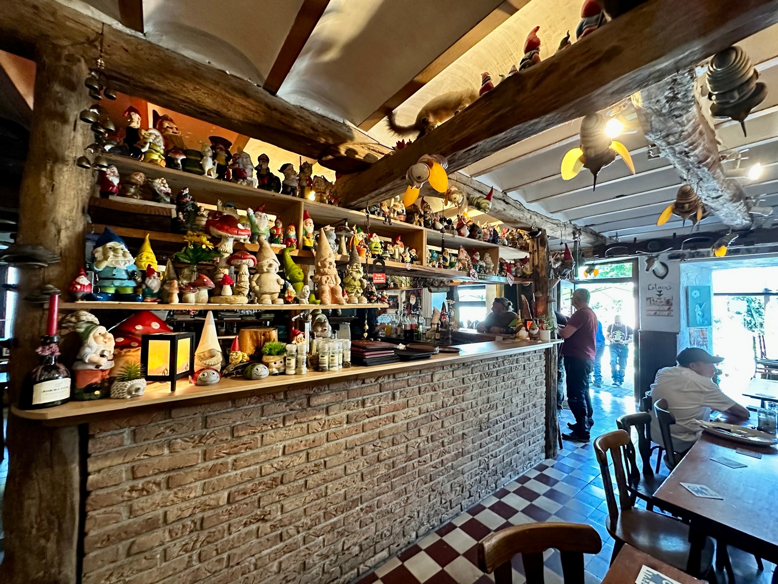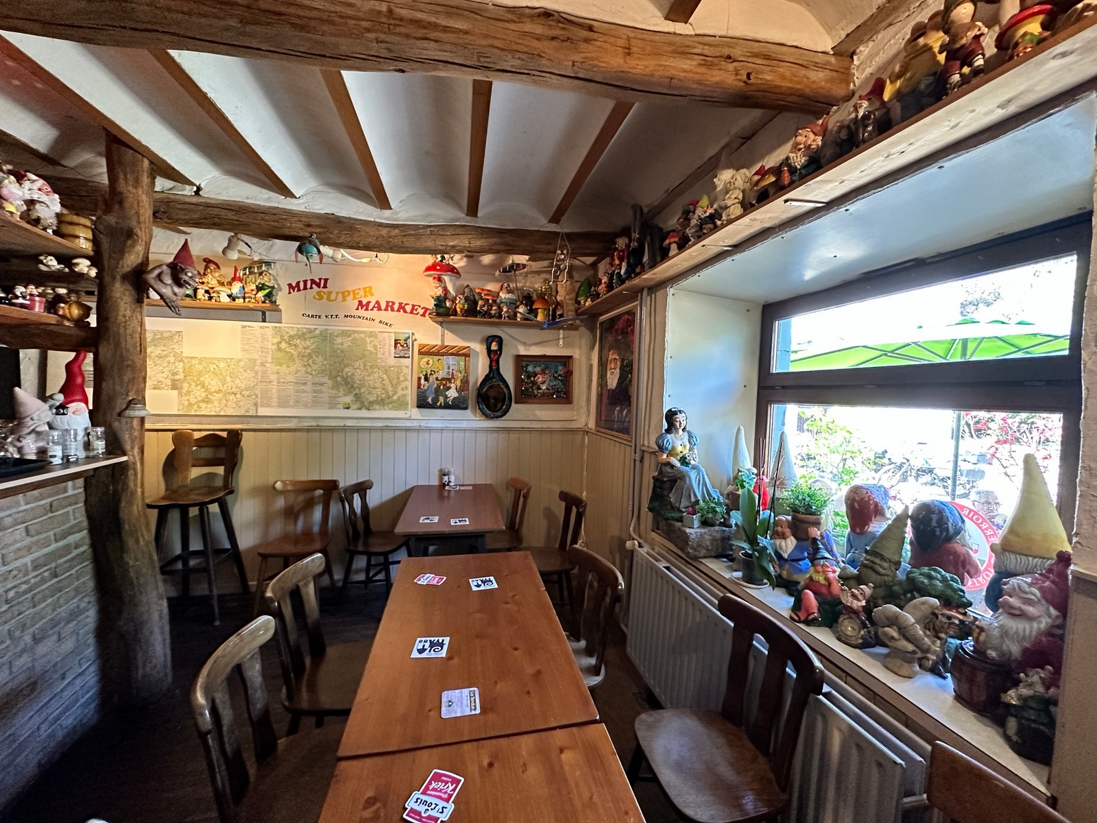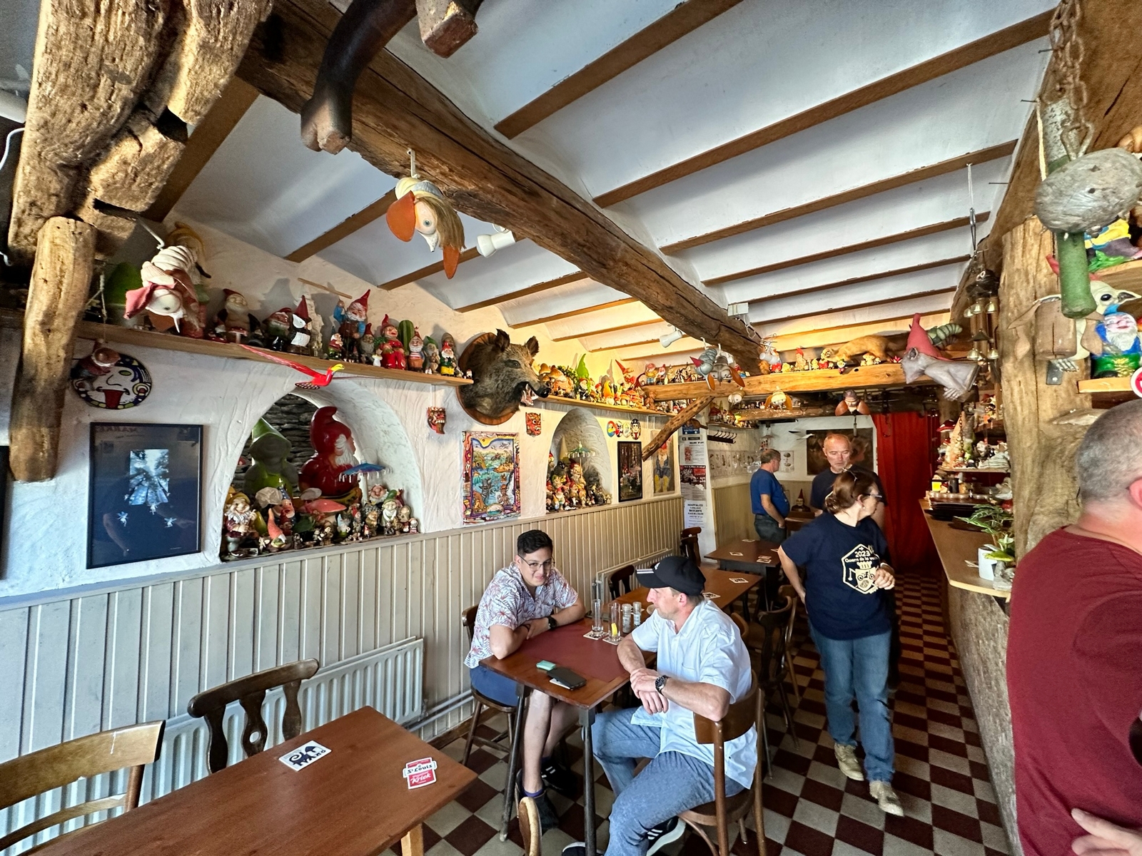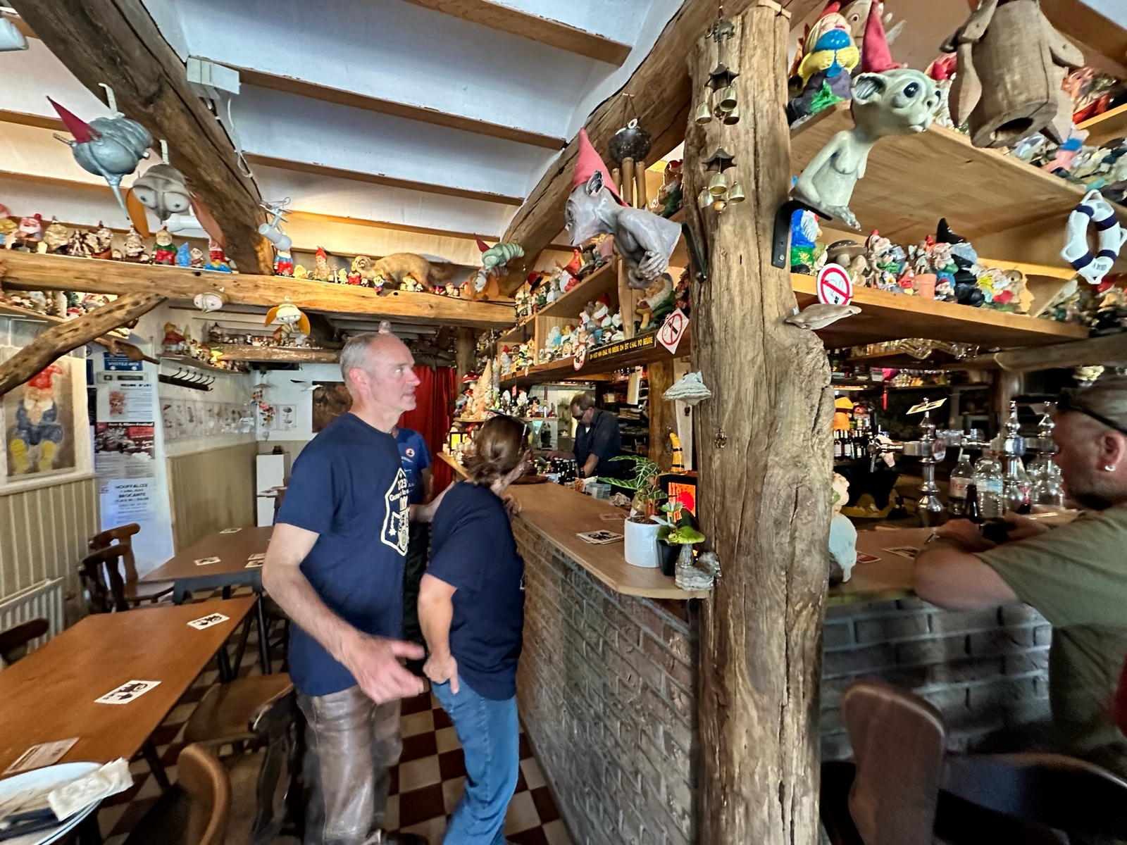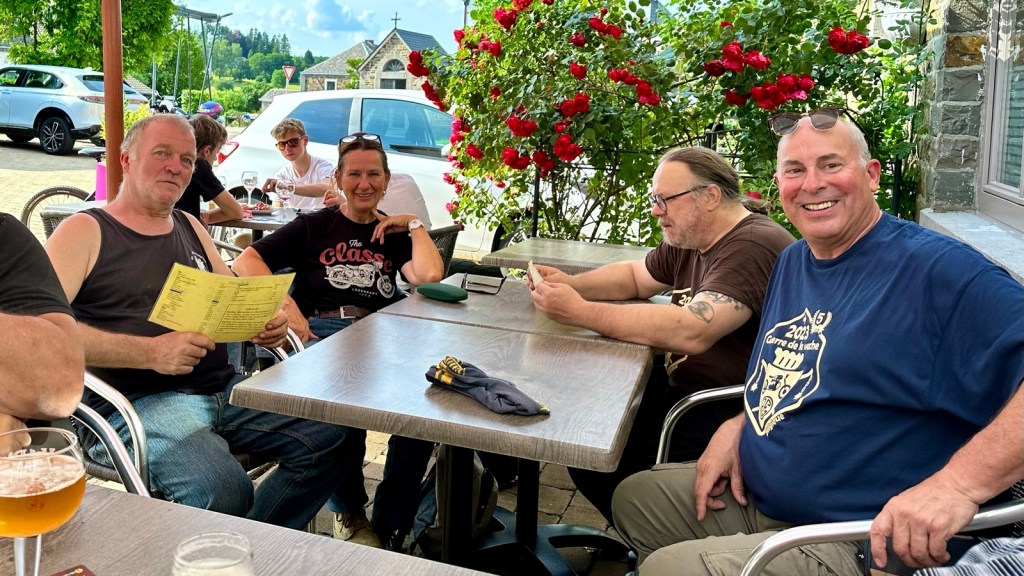 Le midi, le rendez-vous est fixé à un aérodrome site école de vol libre. Un Food-Truck est tout spécialement venu pour nous, on y trouve notre bonheur avec des pains saucisses , le bar de l’aérodrome nous sert les boissons et des frites pour ceux qui le désirent, vraiment une organisation au Top . On reprend nos petites routes pour aller au Musée de la Guerre de Bastogne, puis la soif se fait sentir, faut dire qu’il fait chaud et là on trouve une petite auberge dans un petit village au détour d’un virage, face à l’église, son parking sera rapidement envahi par nos motos et side-car. Et là, surprise, nous tombons sur une collection de plus de 2000 nains de jardin, extraordinaire. On a trouvé l’adresse du FLNJ, front de libération des nains de jardin !😉.