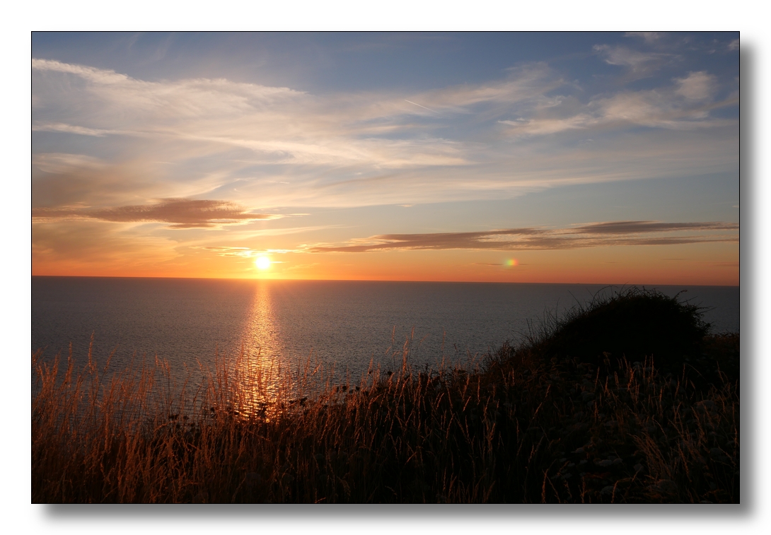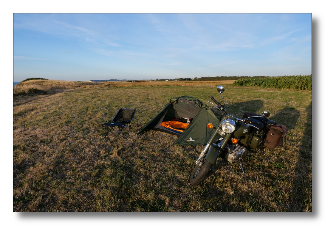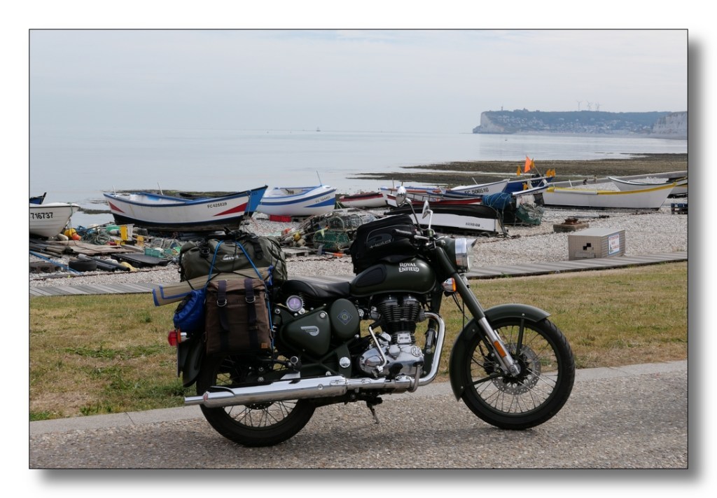 Arrivé à Etretat, je gare la moto pour une petite balade en ville et sur le bord de plage, on m’a souvent dit « Etretat c’est superbe… », étant Artisan-Photographe, j’ai très souvent tiré des photos de touristes y venant, je reconnais les vues mais j’avoue que je suis plus friand de l’authenticité du Cotentin et du Nord Bretagne… un peu trop de monde à faire les boutiques … donc je continue mon chemin pour trouver un lieu de bivouac, le camping est à bloc et les prix sont exagérés. Un copain Breton m’a rencardé sur un spot, je le trouve, je fouine et trouve à m’installer encore mieux. L’endroit est parfait, en haut de la falaise, assez loin du bord 😉 pour éviter toutes mauvaises surprises. Je vais avoir un coucher de soleil somptueux et y passer une bonne nuit.