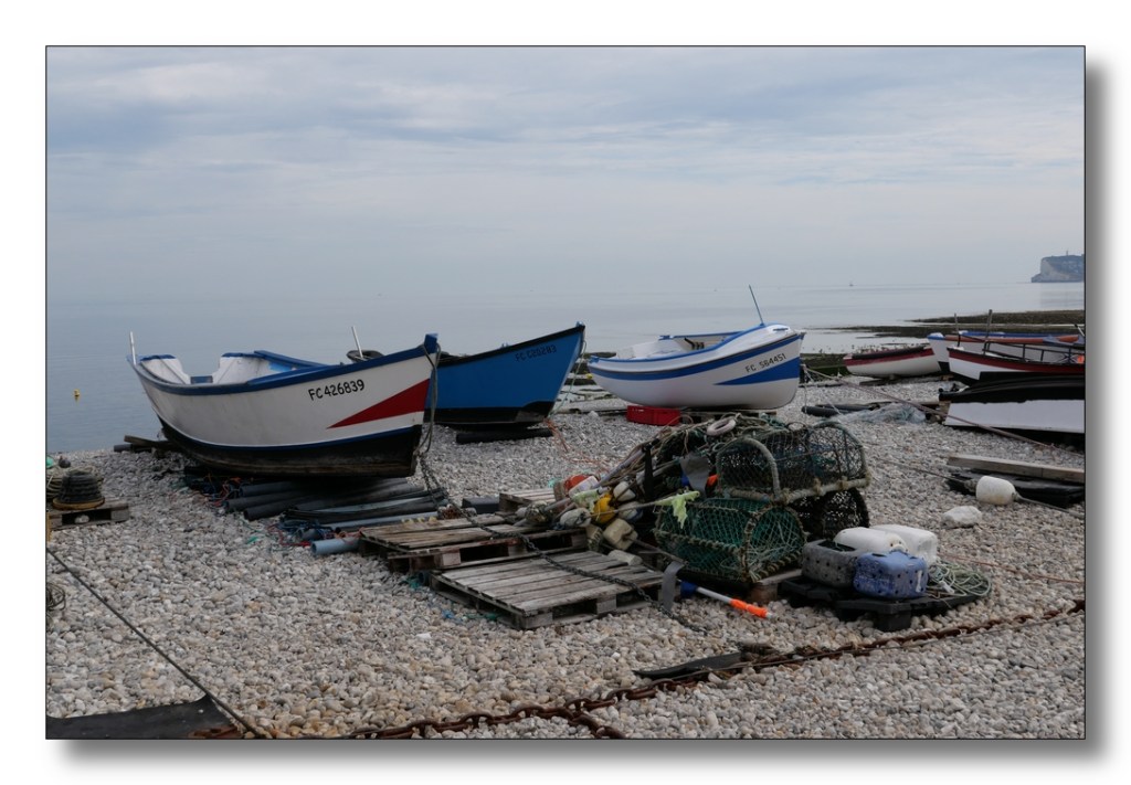 Je file vers Yport, j’y trouve une douche près du poste SNSM, sur la plage, parfait. Je poursuis le long de la côte, m’arrêtant à la vue des barques, appelées localement « Caïques » de pêcheurs , Fécamp est en vue, j’emprunte des chemins de campagne, la matinée est agréable.