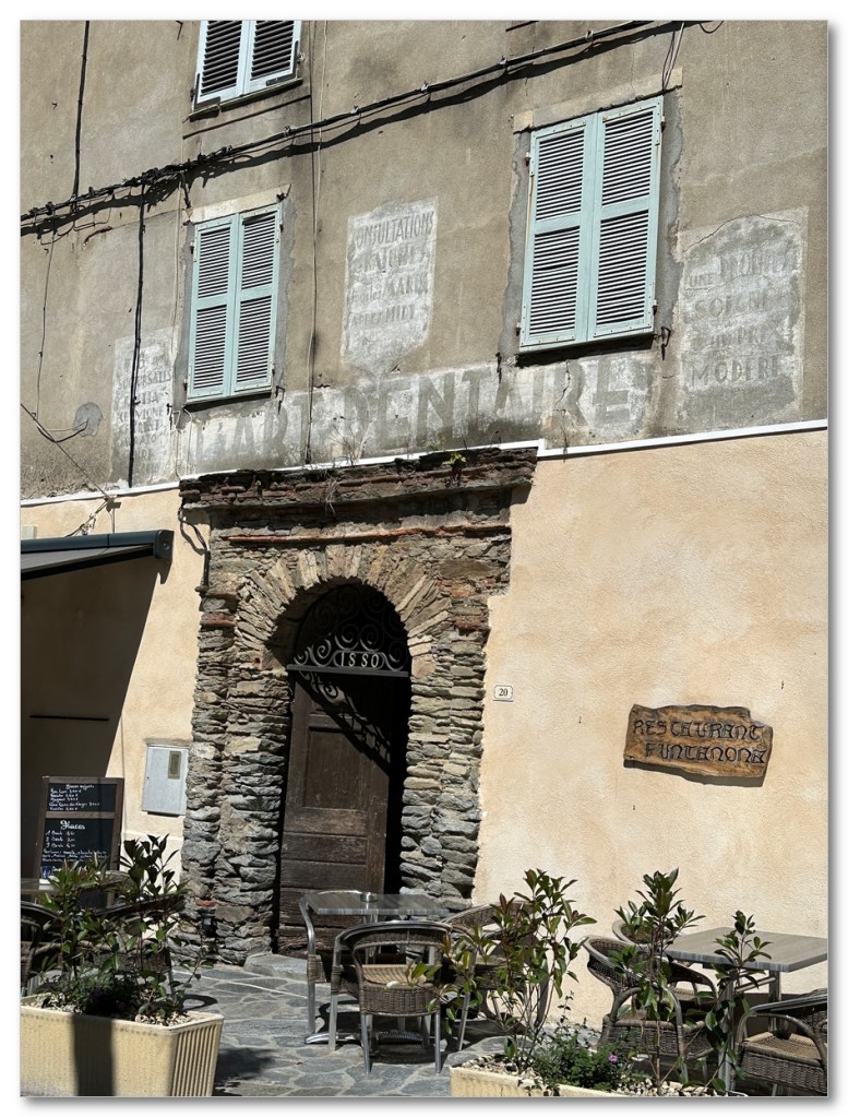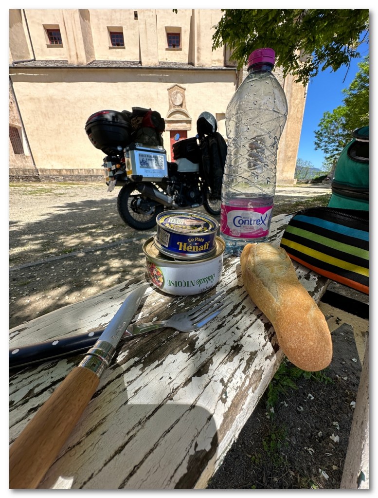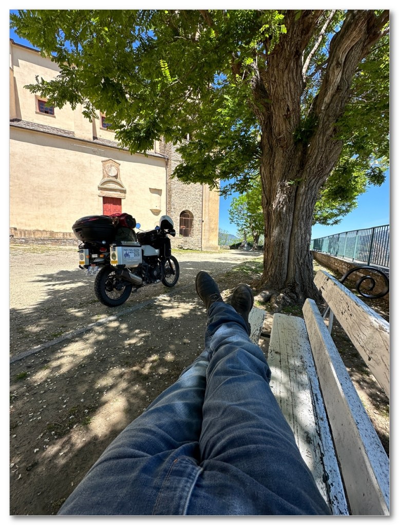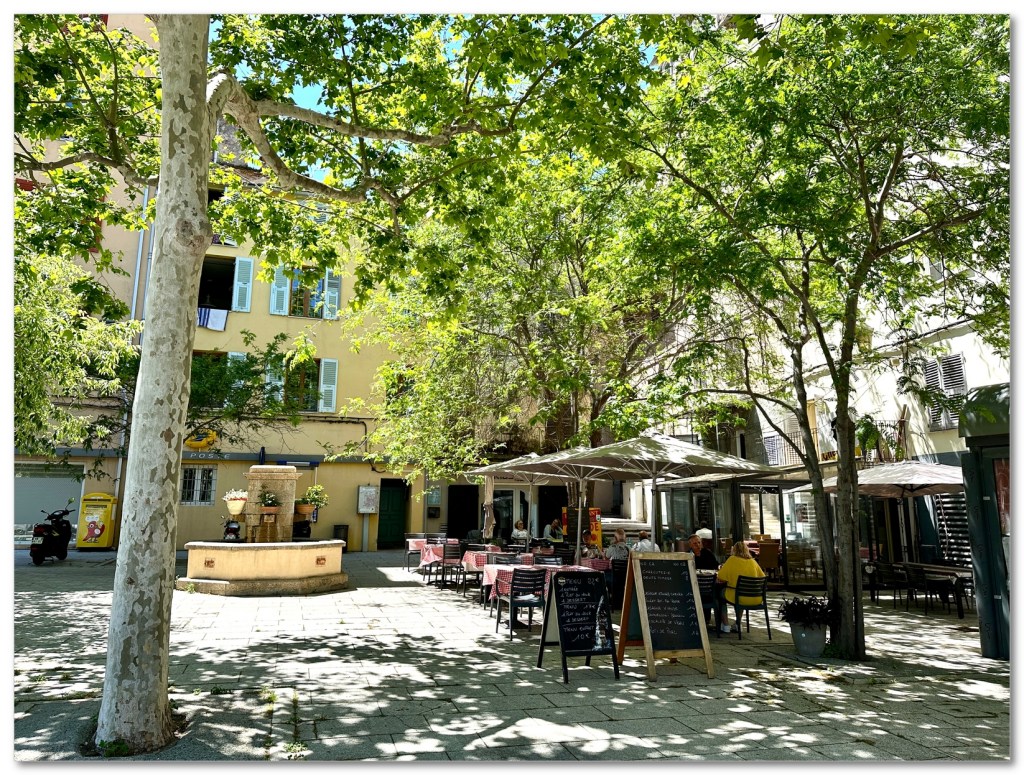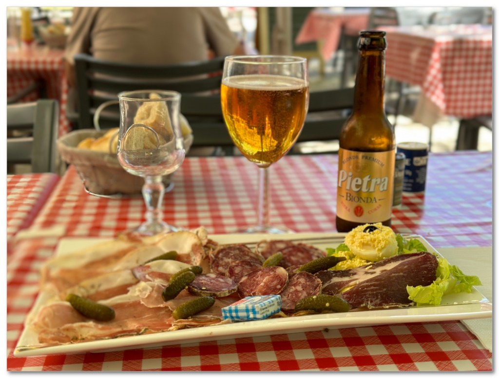 Avant de reprendre la moto, je traverse et choisi de manger sur place. Je trouve un restaurant super, « Chez Ade », place Louis Vincentti. Le couple est vraiment adorable, la clientèle autour de moi est composée d’habitués. Vraiment cette balade dans Bastia est sympa. Je mange une assiette de charcuterie Corse (ou pas) avec sa Pietra (très bon pour la récupe) et je fini par un gâteau Corse, je ne sais plus le nom, mais, comme m’a dit le patron, « C’est divin ! »