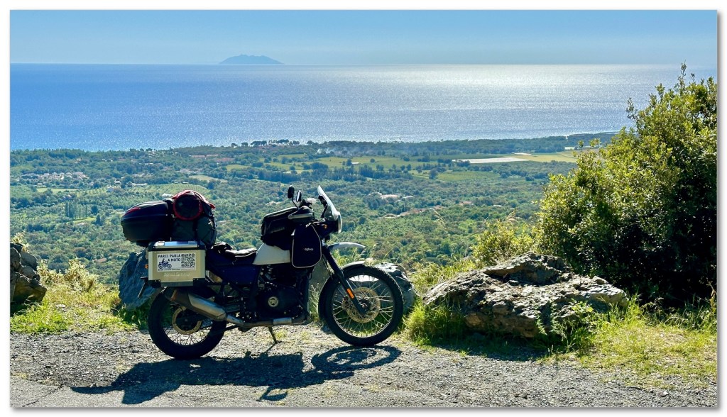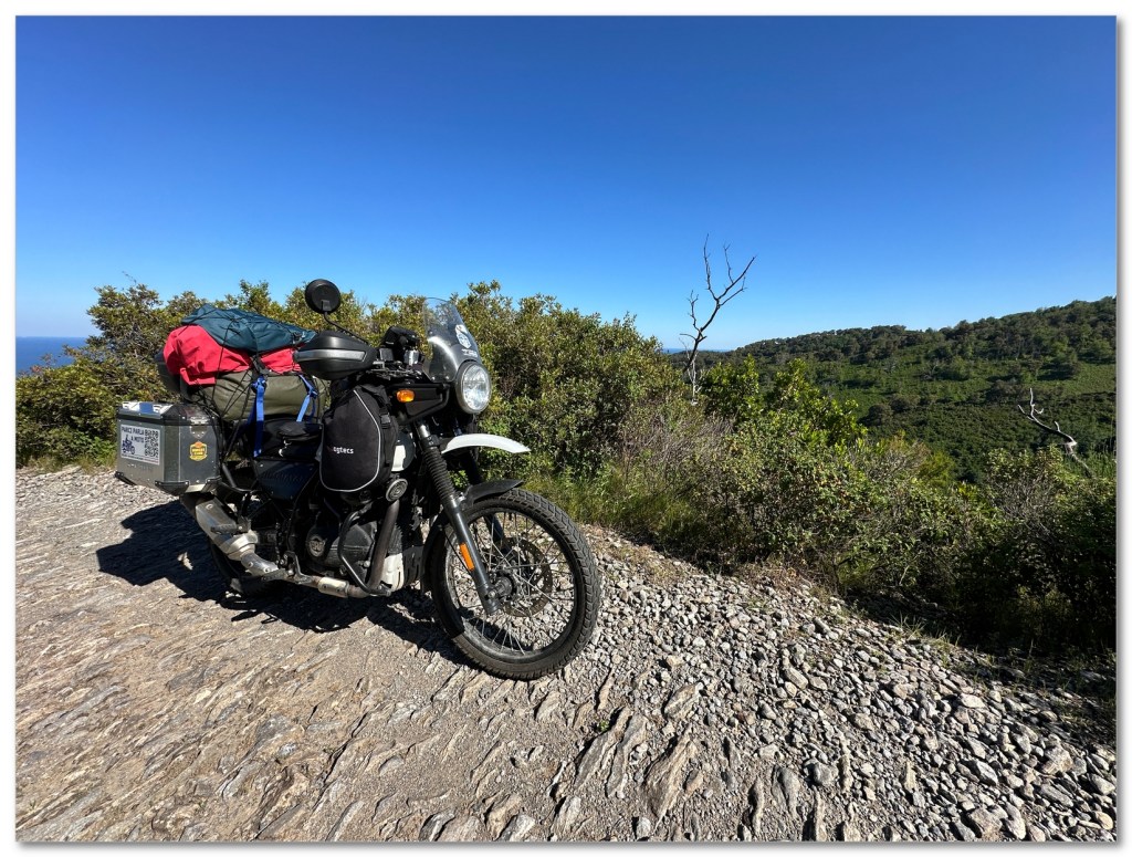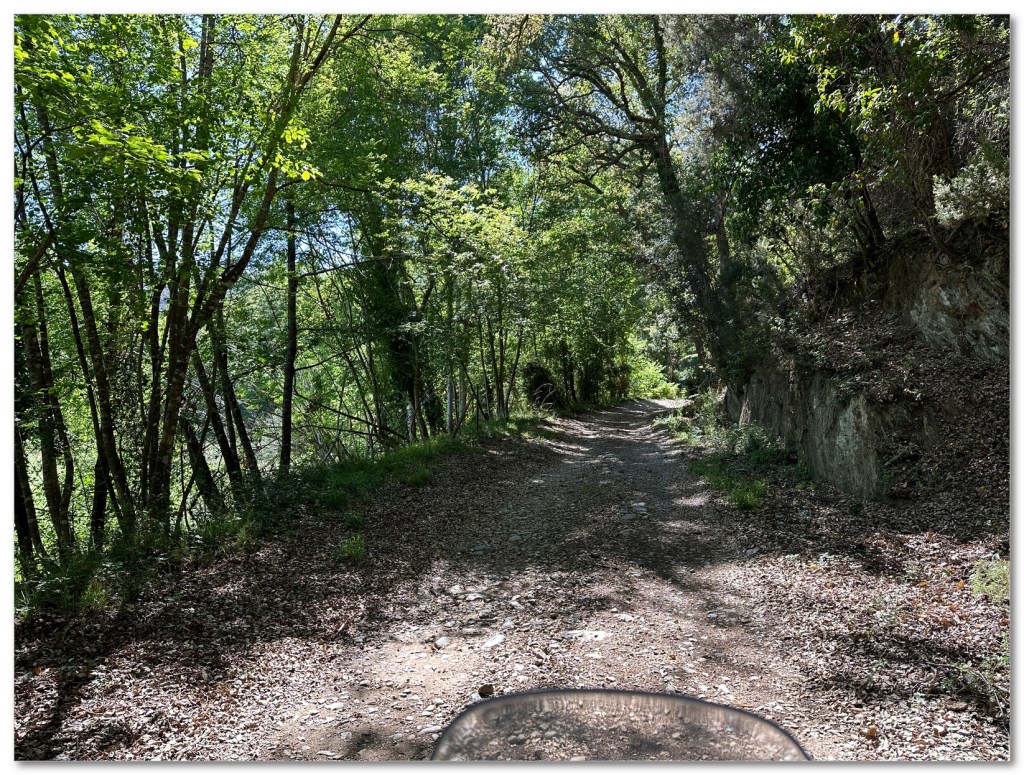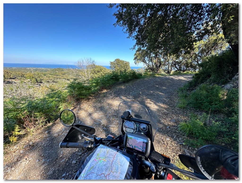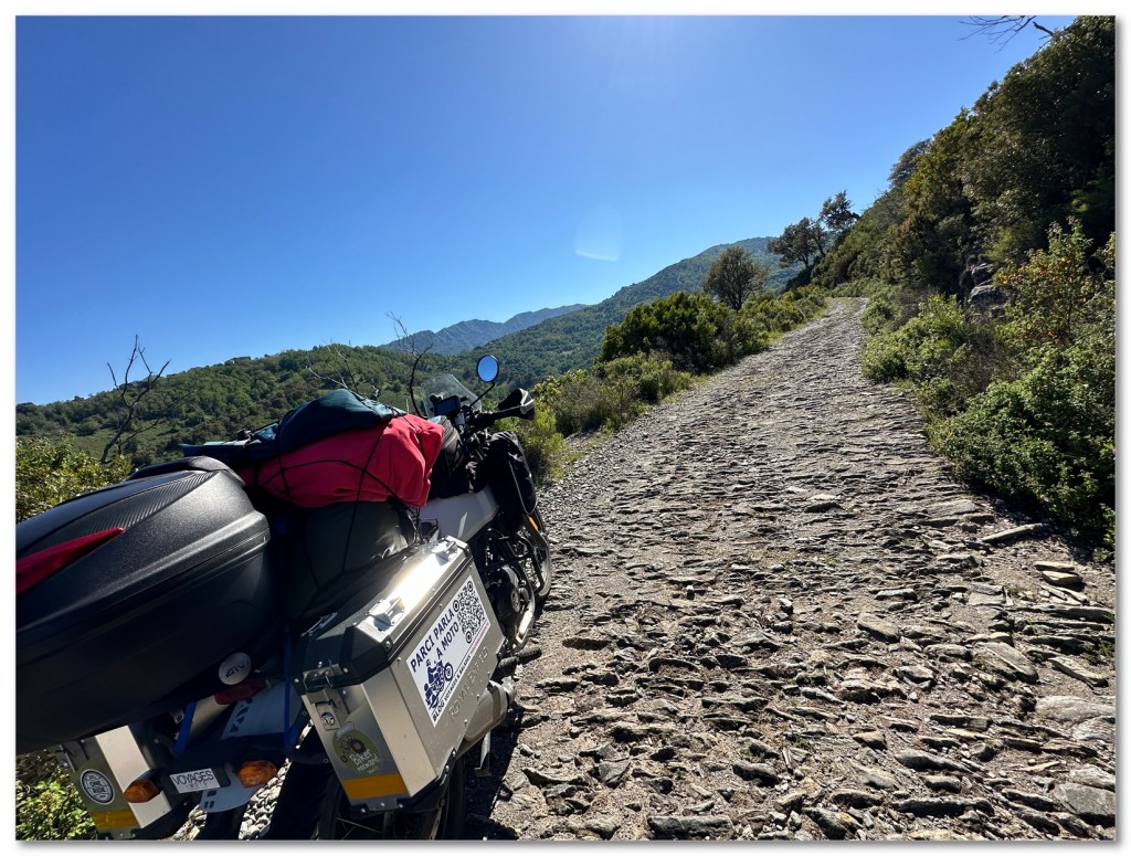 Puis je ne sais quoi, je ne sais où, j’ai fauté, je me suis retrouvé à nouveau sur la RT10, bien roulante, un peu trop pour moi. Un coup d’oeil sur ma carte et quelques infos au GPS, je prends un peu plus loin sur ma gauche la D30 menant à Talasani. Quelle fut pas ma surprise plus avancé sur cette petite route… un quad en travers à charger du bois, je le contourne, vois un panneau indiquant, circulation uniquement en 4×4, alors ni une ni deux j’y vais, et normal, j’ai 2 roues et de plus un Trail comme machine. Bon je suis chargé à bloc, mais ça le fait et je me retrouve plongé dans un décors magnifique, parfois en sous bois ou devant un panorama sur la cote orientale de la Corse. J’adore, surement une ancienne voie romaine, en tous cas , il y a eu pas mal de trafic, passé un temps à voir le pavage.