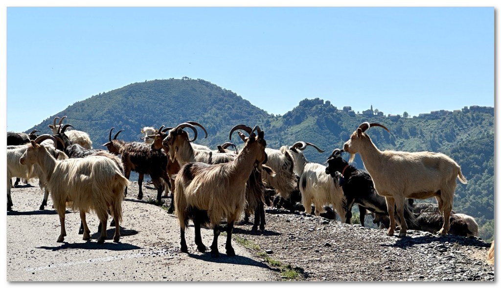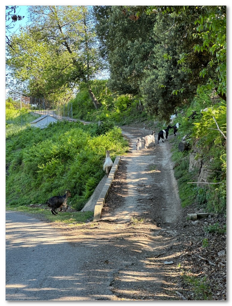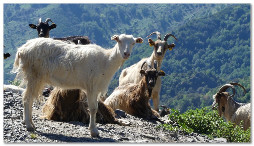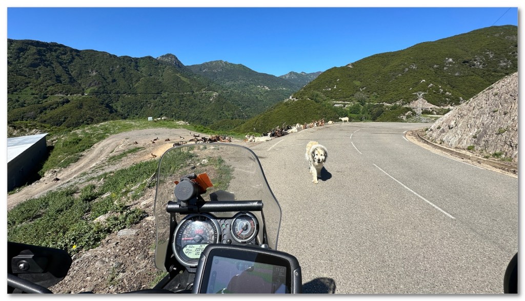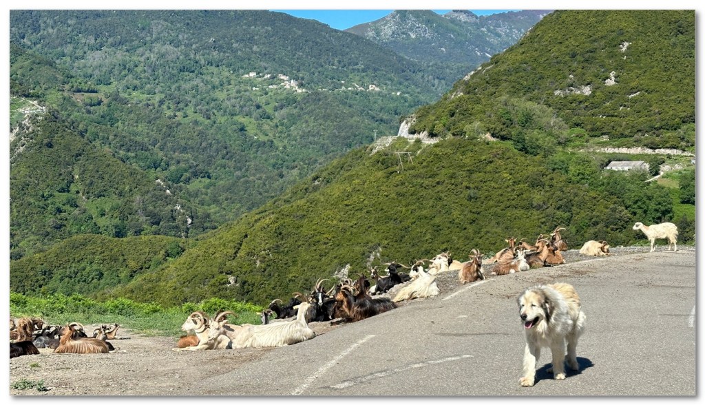 Tout le long ce sera magnifique, la Castagniccia me dévoile au fil des kilomètres sa beauté. Pour commencer, un troupeau de chèvres, et il y en a un paquet au bords de la route, voir sur la route. Le Patou chargé de les surveiller, voit la vie autrement. il vient à ma rencontre et cela uniquement pour recevoir des caresses. Le bestiau est adorable.