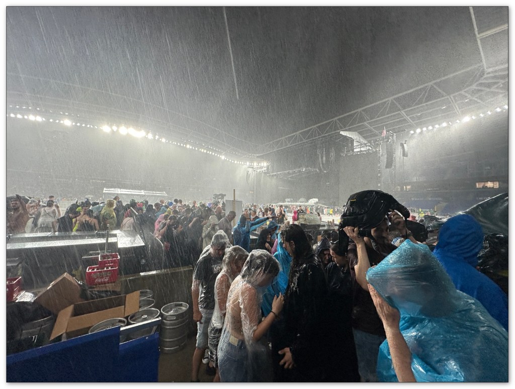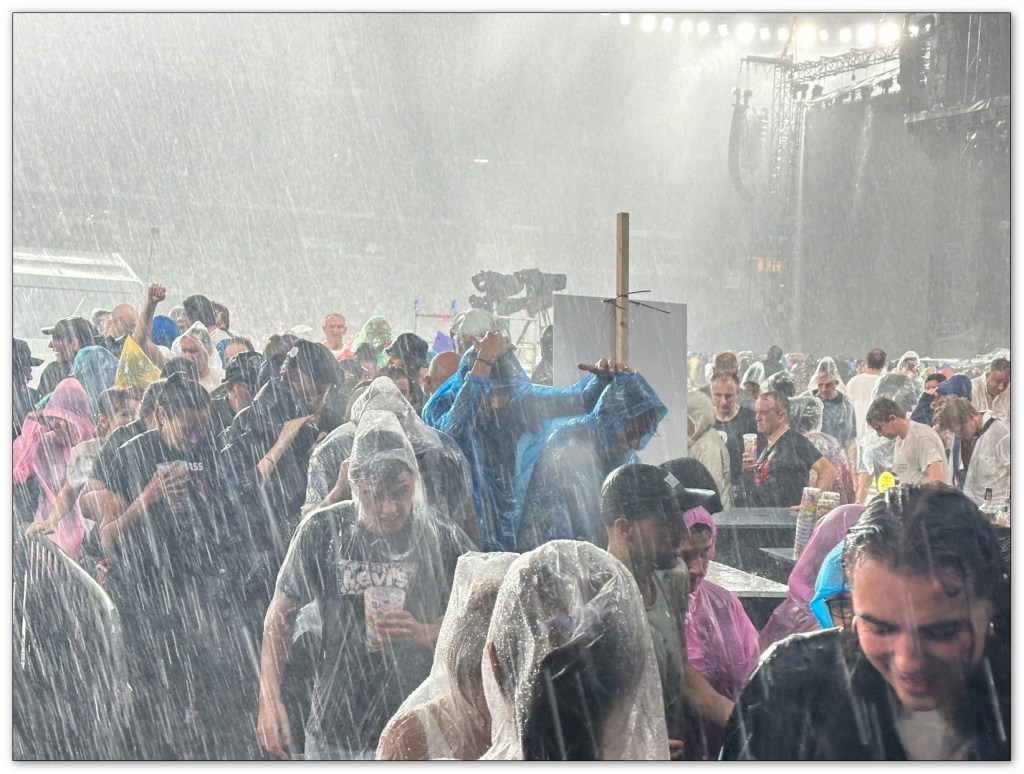 Cela fait 1h que le groupe est sur scène, en pleine chanson, Springsteen stoppe net , il s’est mis à pleuvoir, l’orage qui était prévu est là, et fort … il nous demande d’évacuer la piste, Nous le faisons.