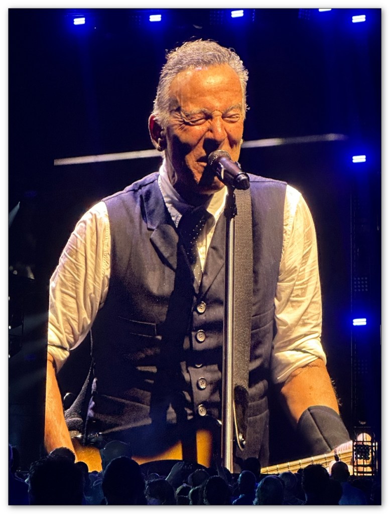 21h30 Springsteen du haut de ses 75 ans bien passés, arrive avec le groupe, c’est le délire. BRUUUuuce, hurlé par le public, tout sourire comme toujours pour son public il commence le show. Sur fond de message anti-Trump et de liberté, il nous délivre ses textes, sa musique.