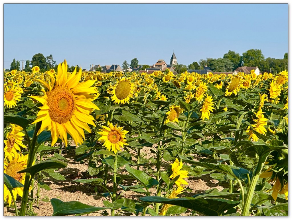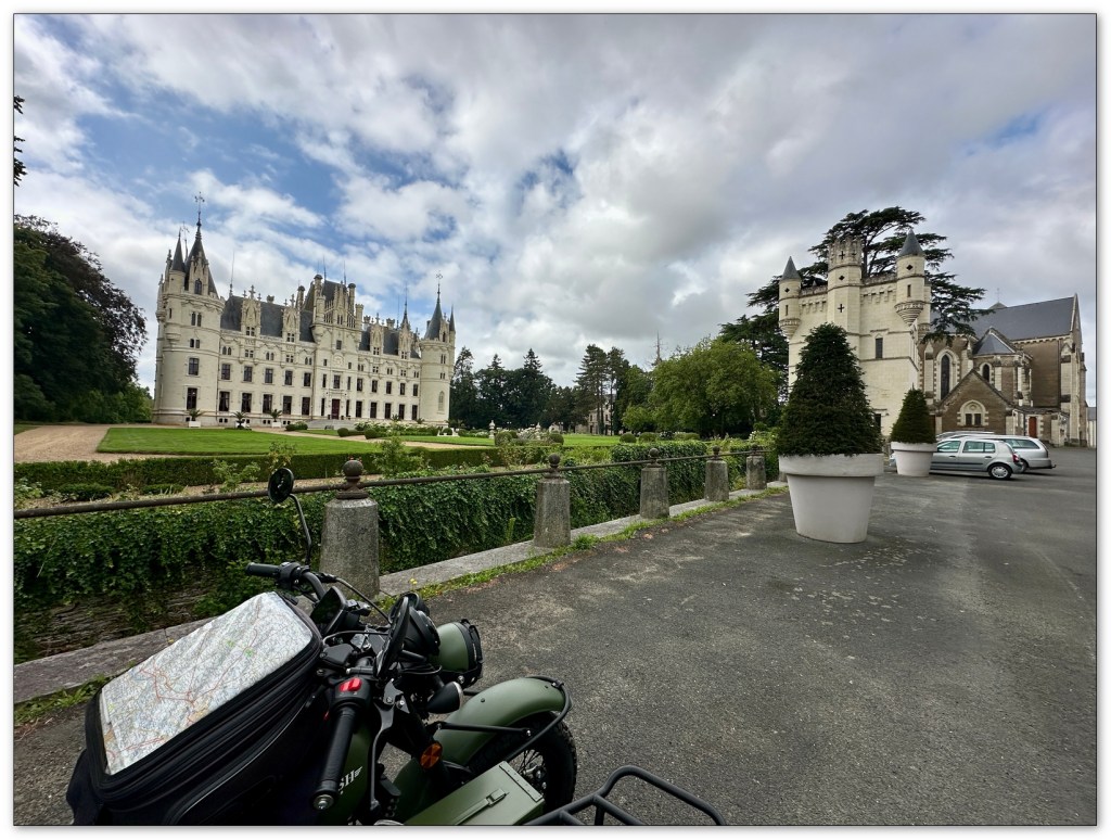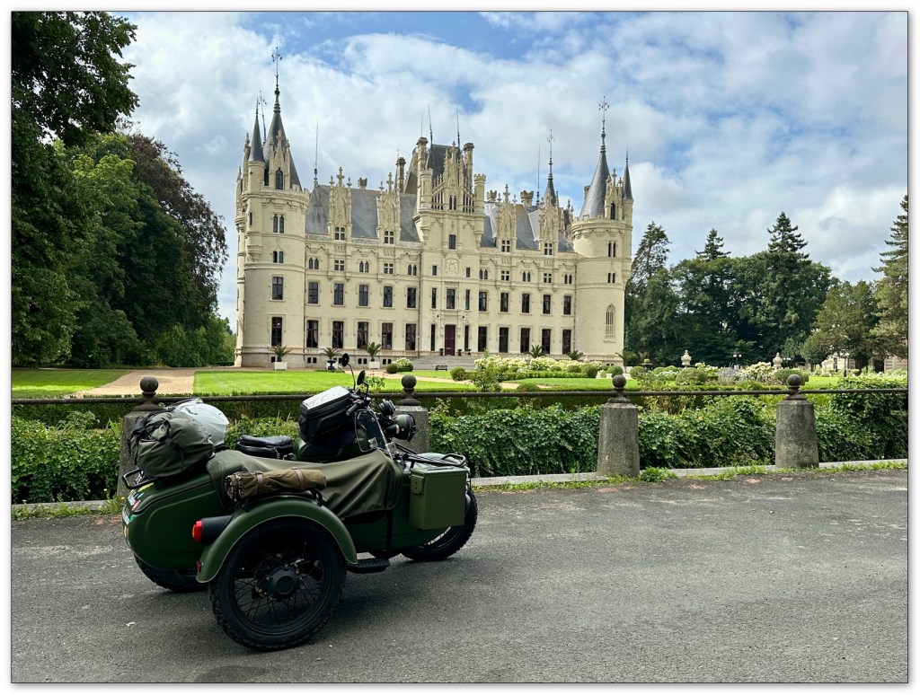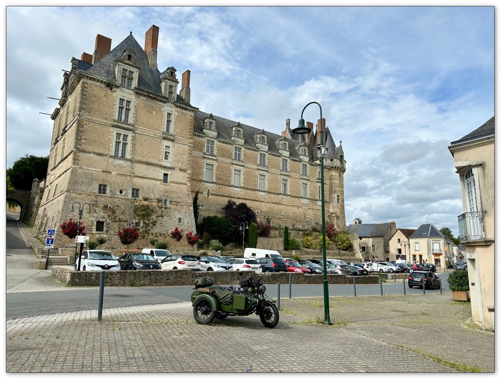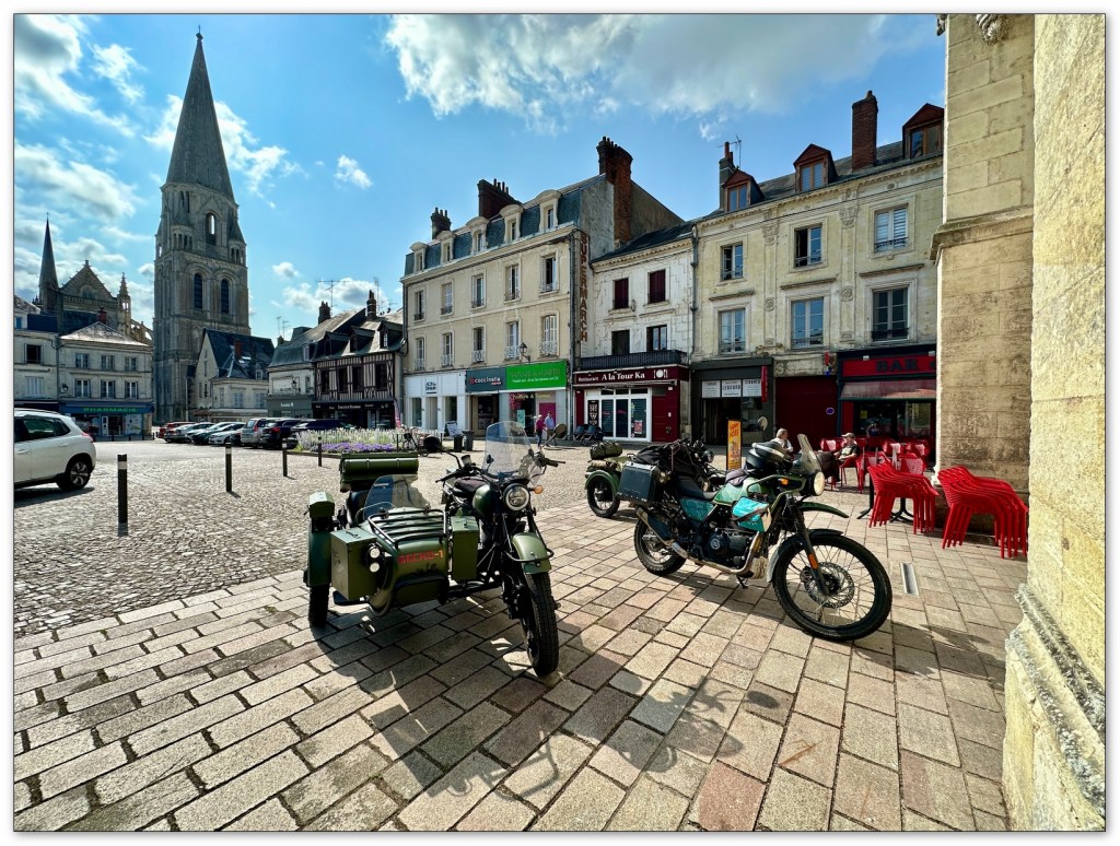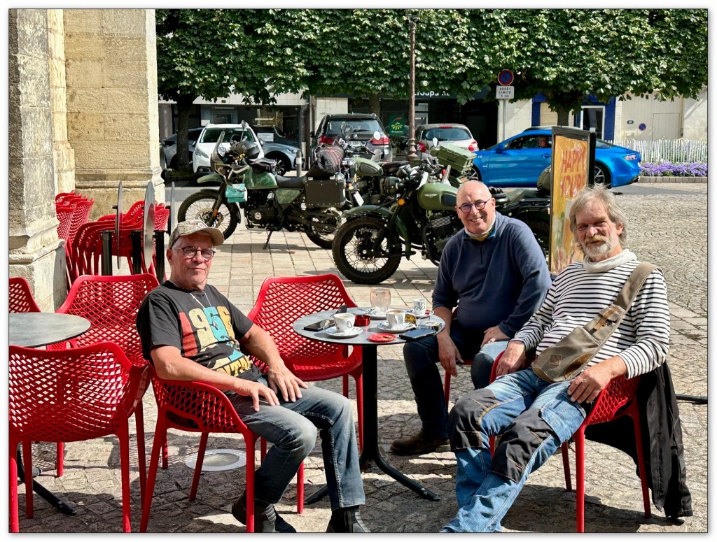 Je traverse la banlieue Orléanaise, plein Ouest. Passé Beaugency, je suis vraiment dans la campagne, je rejoins Vendôme, où j’ai rdv avec Alain-Pierre, un copain possédant le même side-car que moi. Après avoir traversé des champs de tournesols et des paysages déjà moissonnés, je trouve Alain-Pierre en terrasse avec Joël, également à moto avec une Himalayan. Rencontre sympathique, de beaux échanges sur nos vies et pas plus que cela à moto.