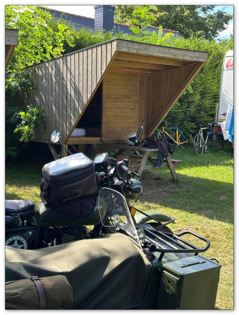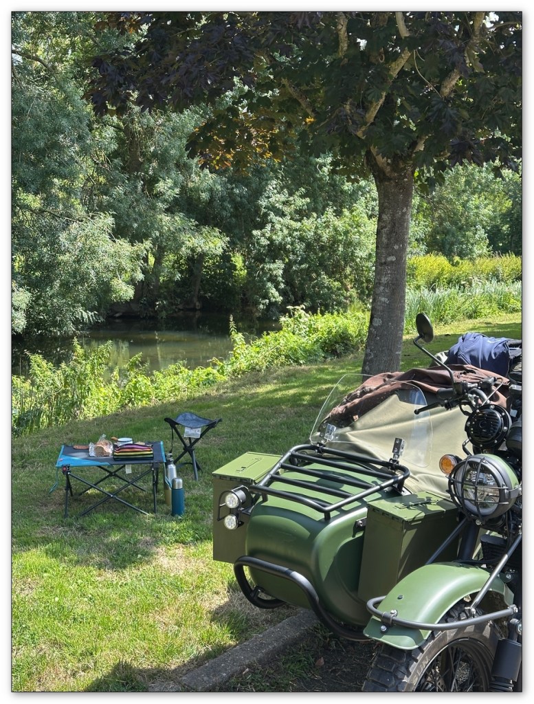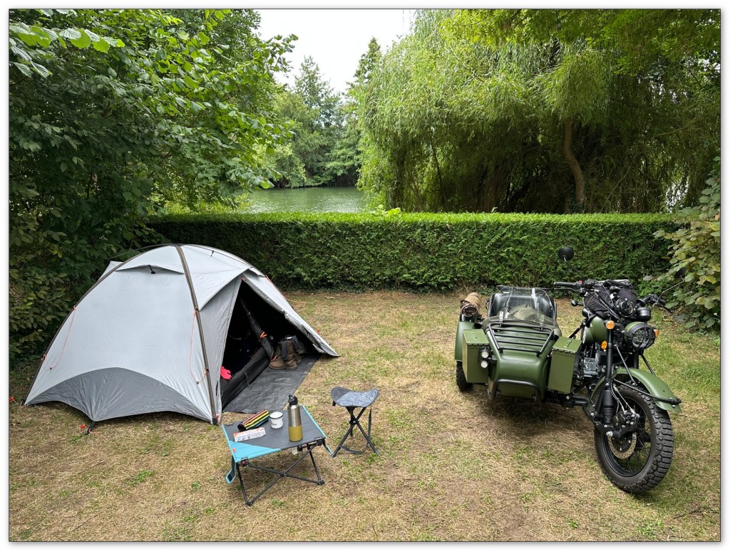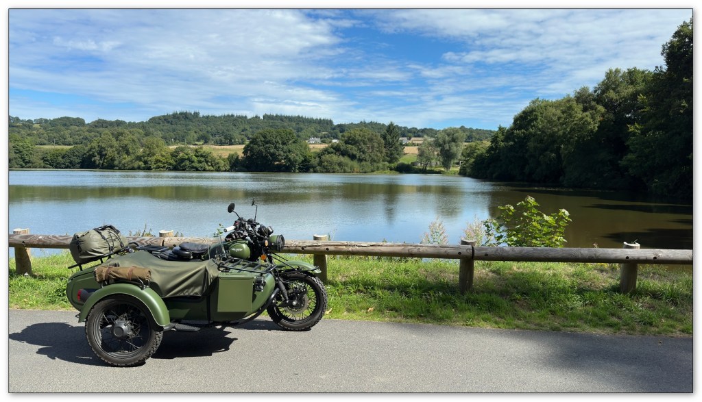 Je roule bien, je prends le temps de piqueniquer dans un village et j’essuie un grain en repartant. Il roule bien ce petit side-car, très agréable. j’arrive en Bretagne, une petite pause Perrier-rondelle, ça rafraîchit et c’est pas plus mal vu la chaleur. Je passe Porcaro, célèbre dans le milieu motard, pour la bénédiction annuelle de la mi-Août, par le prête local, des motos présentes. J’arrive au camping du Lac à Taupon, près de Ploërmel, situé au bord du Lac du Duc. Là je rencontre de suite, Olivier et Catherine, venus aussi, à la formation side-car du week-end.