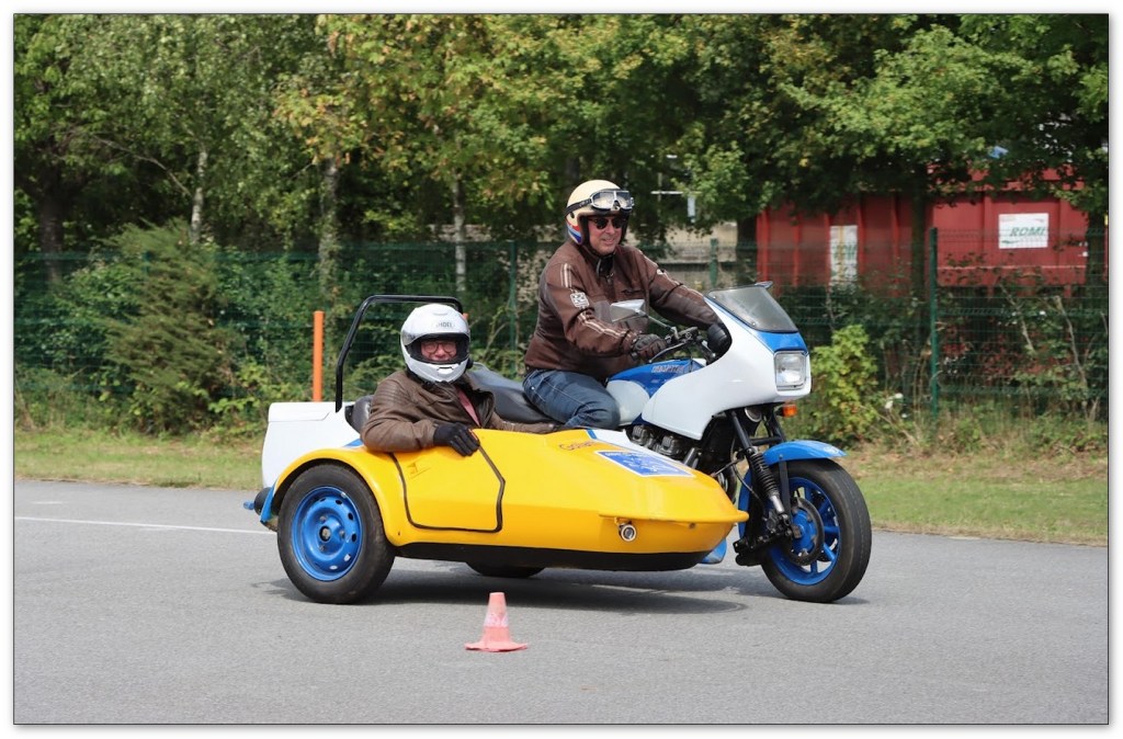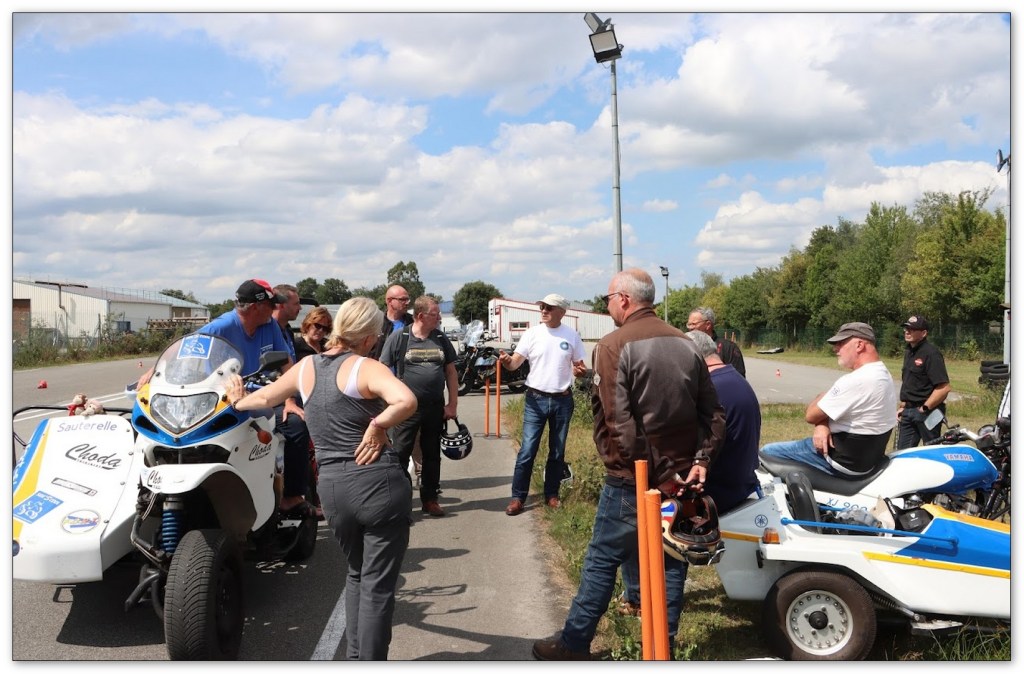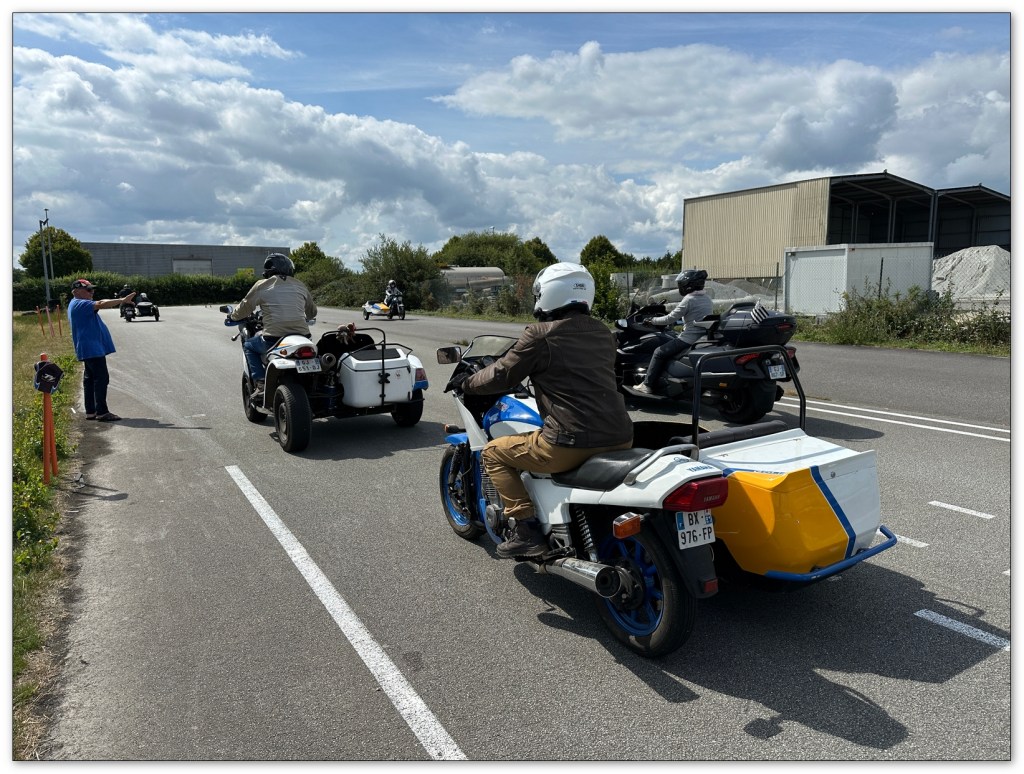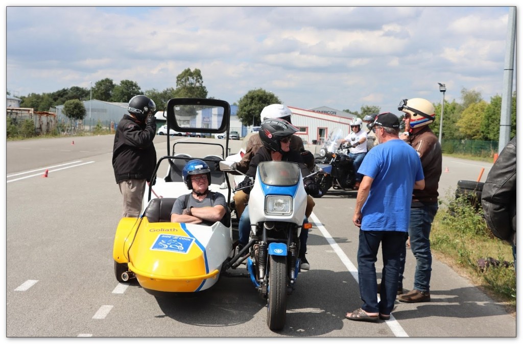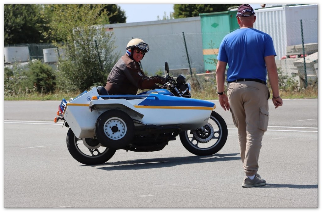 Jean Louis Hergott, passionné et maintes fois récompensé lors de compétions nationales et internationales en side-car, mais aussi formateur moto-école et Yannick Goupil, tout aussi passionné et side-cariste depuis de nombreuses années, lancent les échanges. Ils nous rappellent les différentes lois concernant le side, le marché des constructeurs en France et des marques motos, autorisant ou pas l’ajout d’un panier. Quelques éléments et notions du side-car et nous voilà tous sur le tarmac pour essayer et slalomer avec les différents types de side-car de l’association. Analyses et ressentis de chacun des attelages utilisés. Petites ou grandes roues, fourches standard ou à balancier, et autres. Cela nous promet de beaux moments.