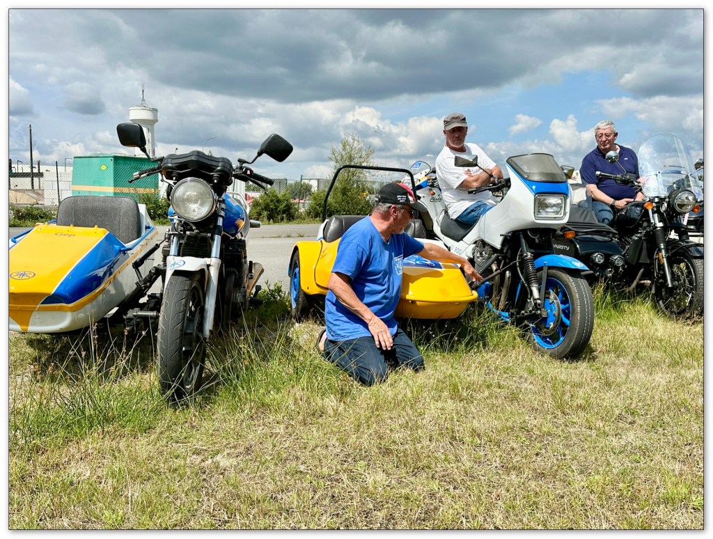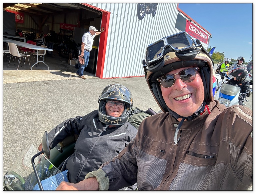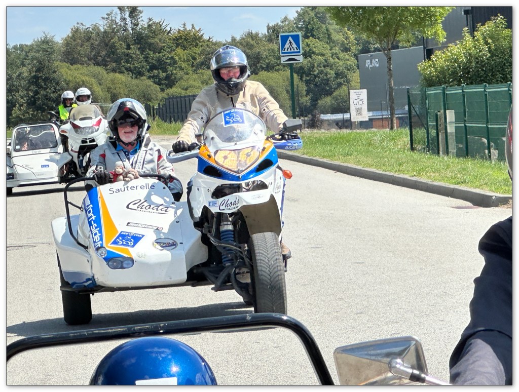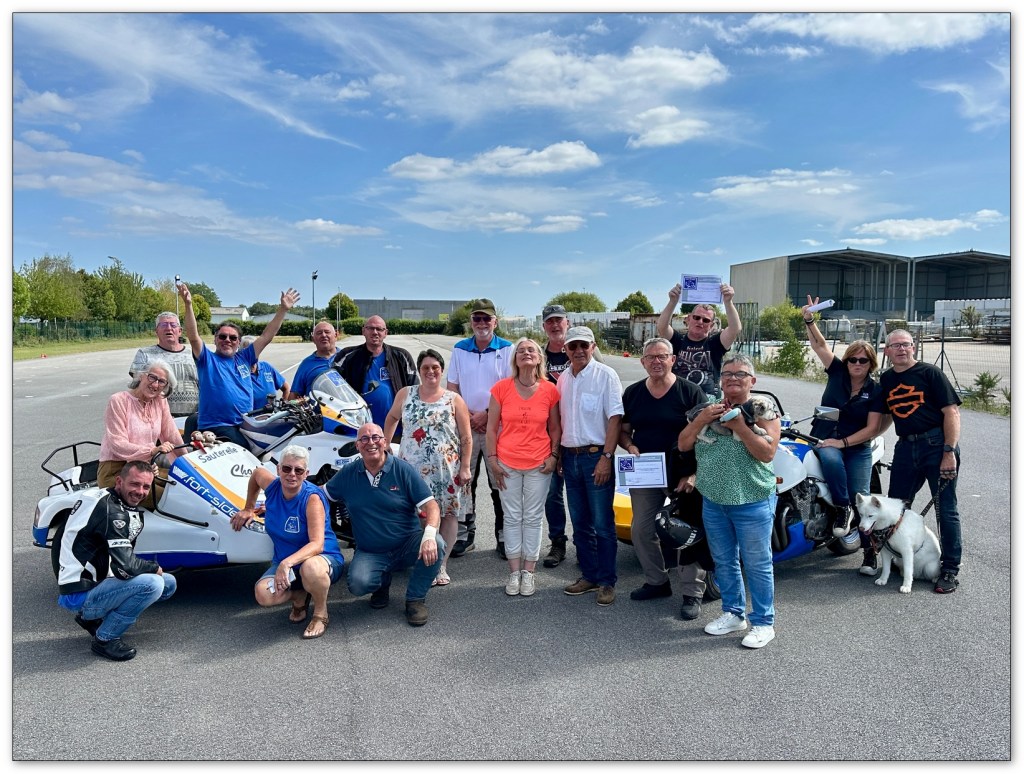 Jean Louis Hergott, passionné et maintes fois récompensé lors de compétions nationales et internationales en side-car, mais aussi formateur moto-école et Yannick Goupil, tout aussi passionné et side-cariste depuis de nombreuses années, lancent les échanges. Ils nous rappellent les différentes lois concernant le side, le marché des constructeurs en France et des marques motos, autorisant ou pas l’ajout d’un panier. Quelques éléments et notions du side-car et nous voilà tous sur le tarmac pour essayer et slalomer avec les différents types de side-car de l’association. Analyses et ressentis de chacun des attelages utilisés. Petites ou grandes roues, fourches standard ou à balancier, et autres. Cela nous promet de beaux moments.