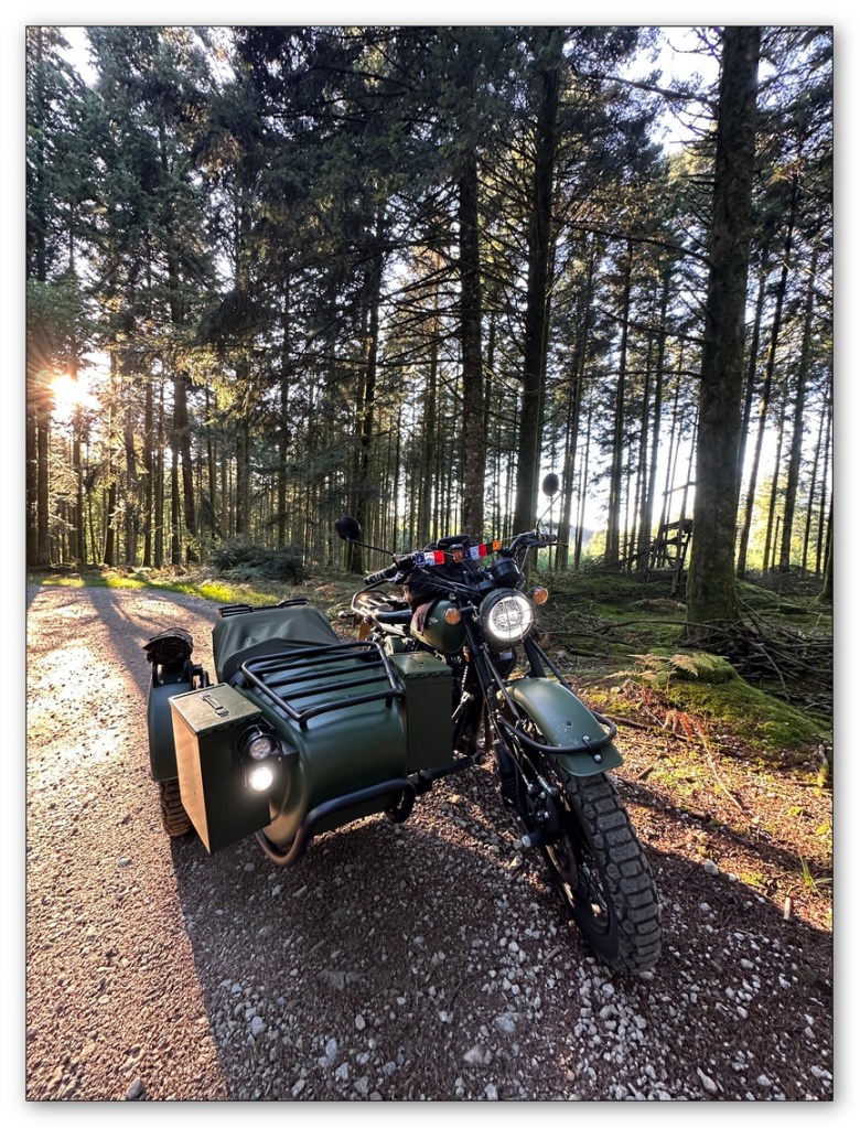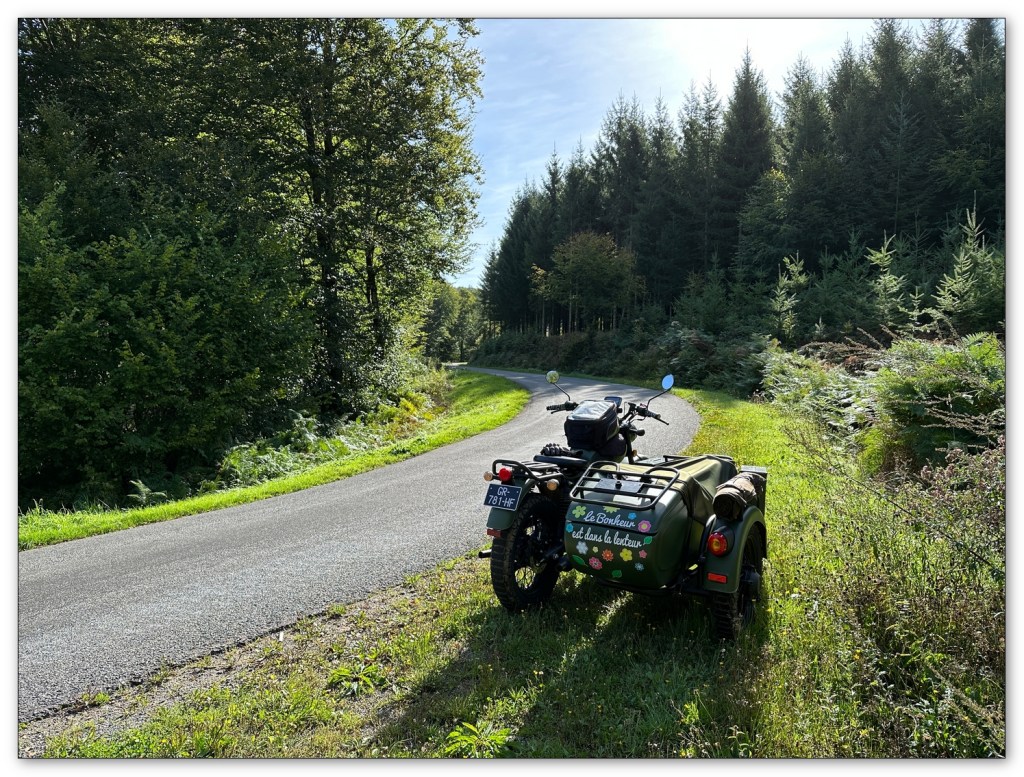 Le Haut-Folin, point culminant du Morvan, est splendide. La forêt est percée par le soleil qui baisse assez vite à cette époque. Un chemin à droite allons-y. Le side-car a ça de sympa , il passe partout. Nous rattrapons la D500, une route qui se prête à la balade à moto , à la condition d’y aller cool, aussi étroite que les paysages sont beaux.