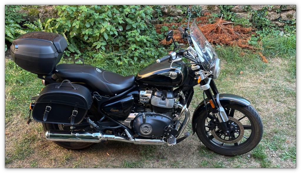 C’est la première fois que nous utilisons la Royal Enfield 650 Super Météor pour un voyage, je l’ai depuis le mois de Janvier, pour remplacer sa petite sœur , la 350 Météor, très bonne moto certes, mais qui s’avérait juste en duo, dès que le relief s’accentuait.