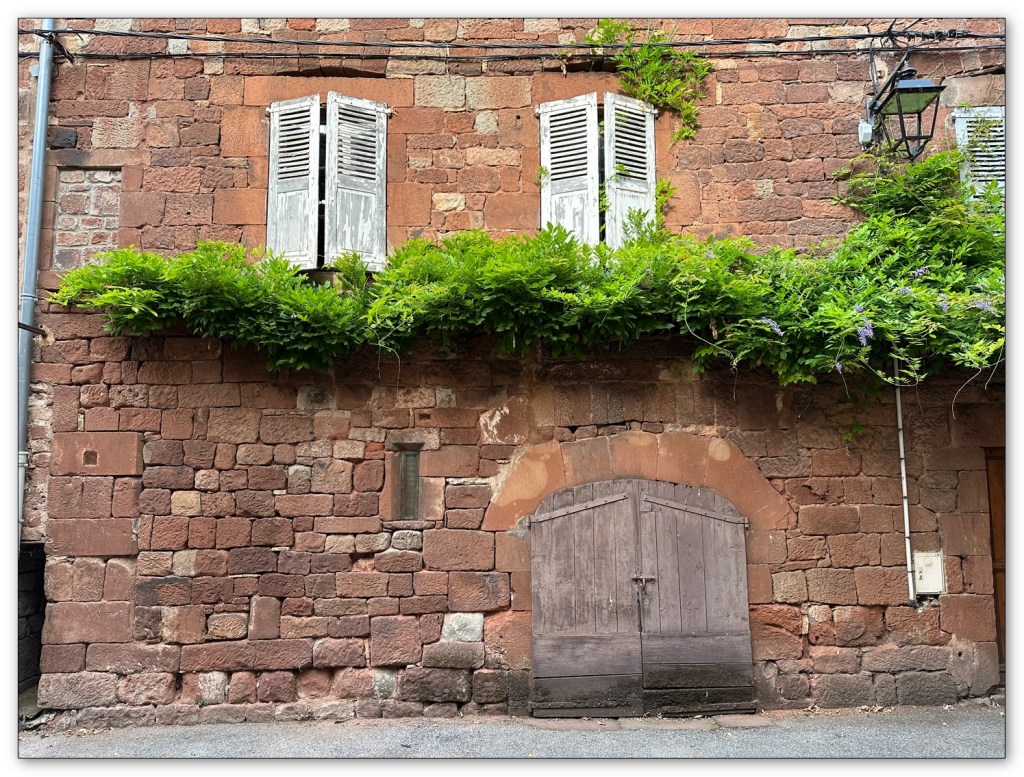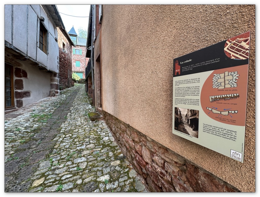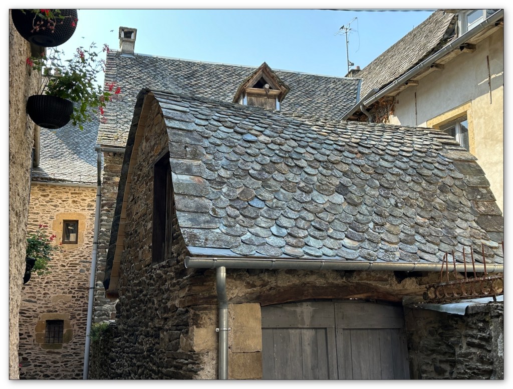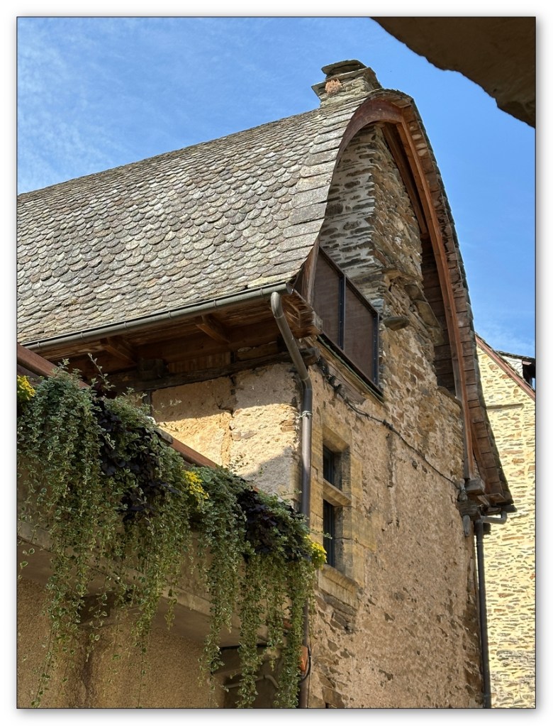 Nous découvrons le vieux bâti de la vallée du Haut Lot , dont certaines maison ont une toitures en coque de bateau renversée, dite à la Philibert Delorme , architecte du 16ème. Toiture à 2 versants galbés, qui a la particularité d’augmenter le volume, très utilisé à l’époque pour y mettre le foin . On trouve aussi quelques notes d’humour de certains habitants pour la devanture de leur maison.