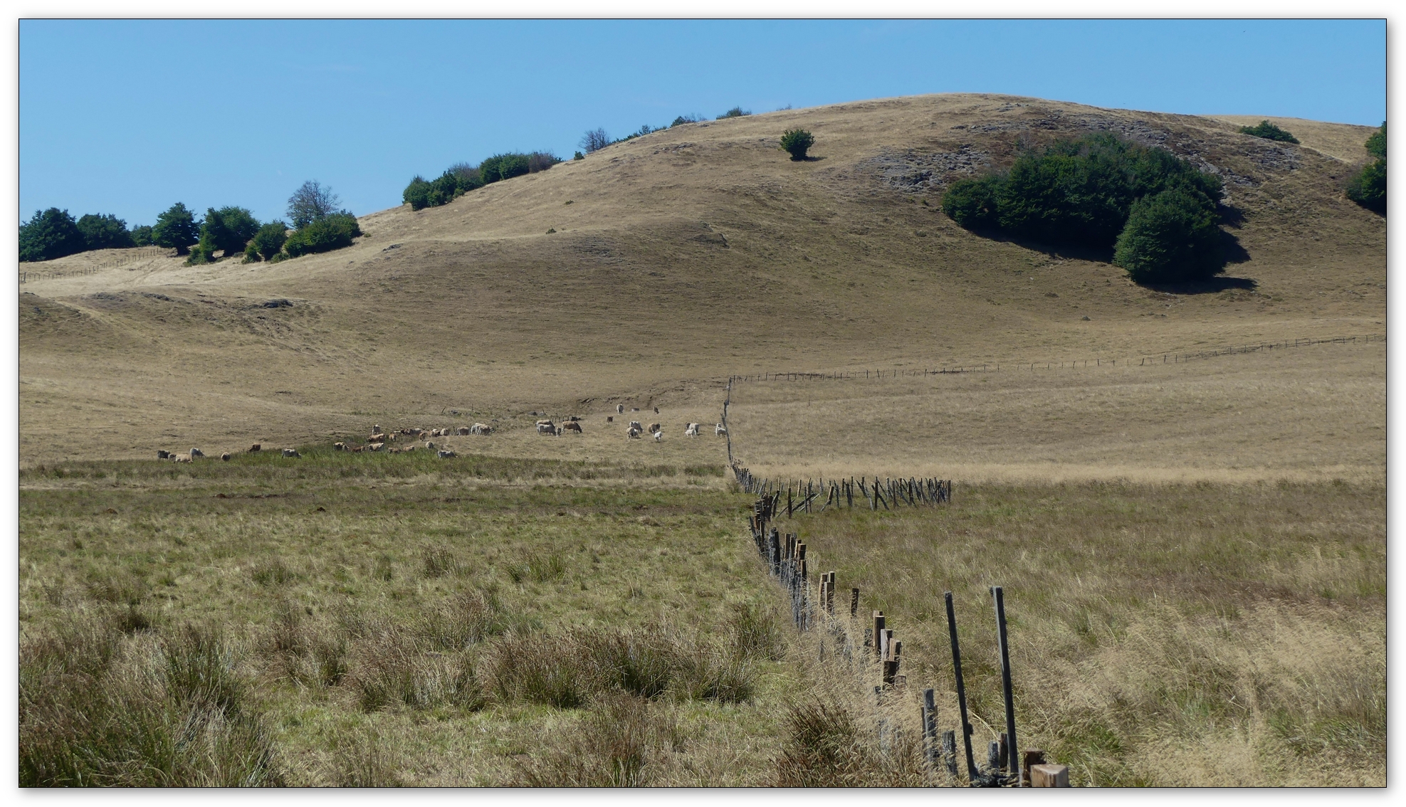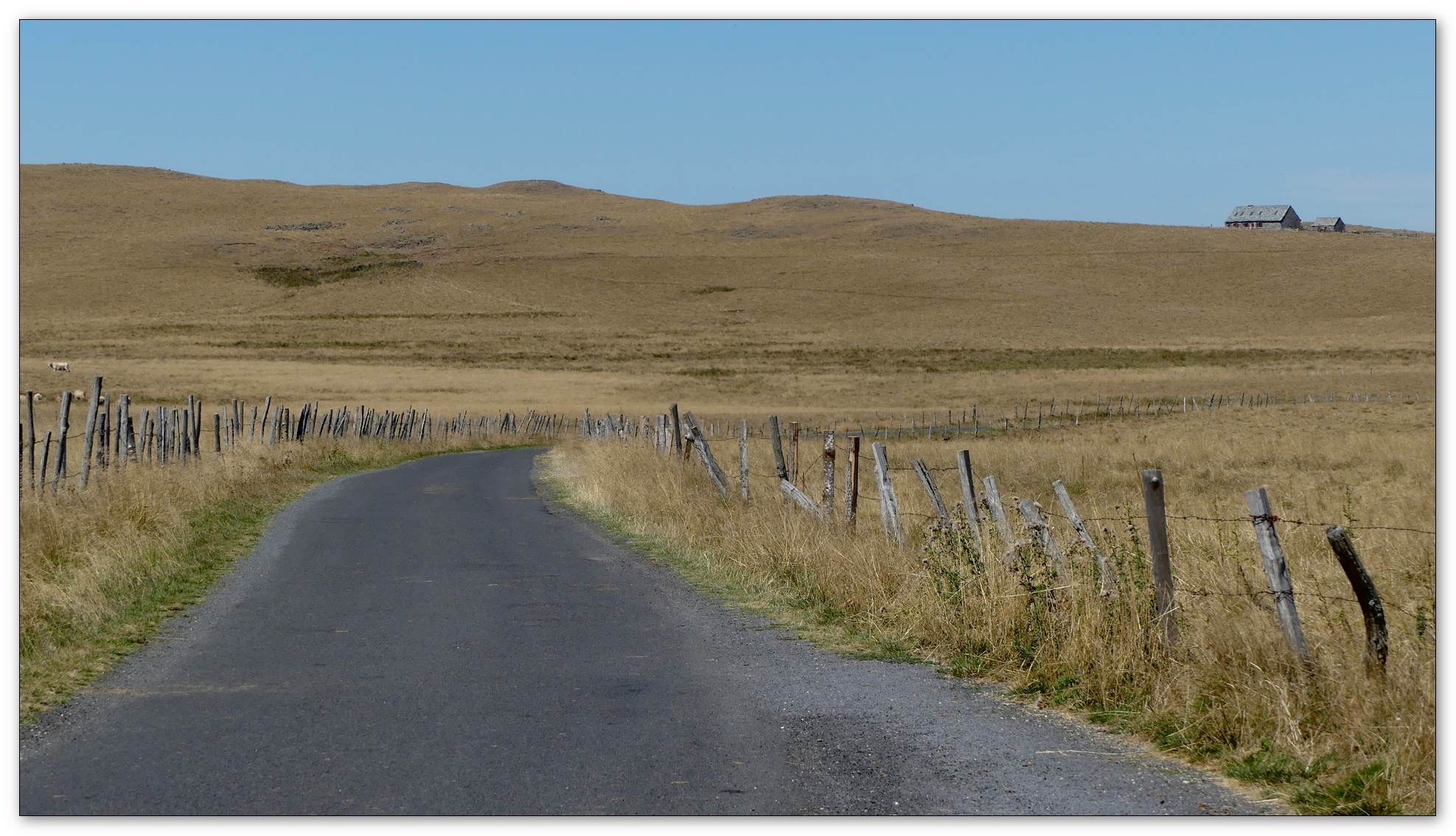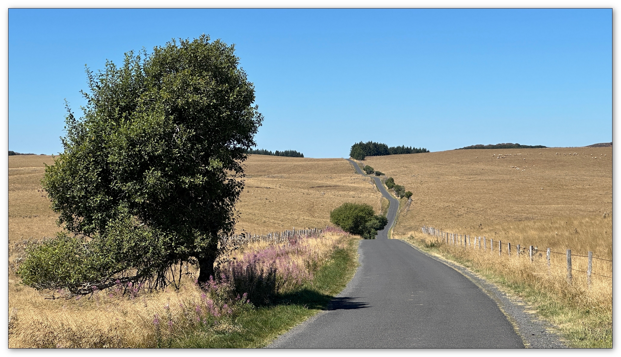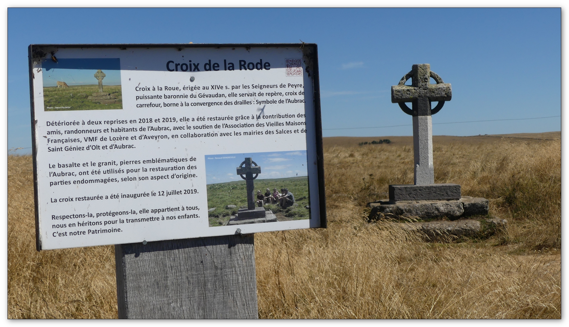 Arrivé sur le plateau de ll’Aubrac, je cherche la Croix de la Rode. Je me rappelle de ce lieu et de la route au milieu de ce paysage typique du plateau. Après quelques demi-tours, nous trouvons cette toute petite route à peine marquée sur la carte Michelin. Nous en prenons plein les yeux, nous adorons ces décors de steppes, comme ceux du Causse Méjean (08-2022 – cf article dans ce blog). Ici et là, quelques troupeaux agrémentent notre montée et le paysage du plateau.