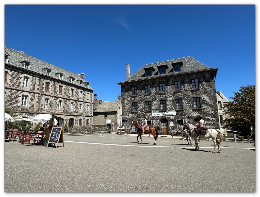 Les heures passent vite, nous rejoignons la place du village d’Aubrac. L’annexe d’Aubrac, bar-restaurant, nous acceptera malgré l’heure. Nous dégustons une Saucisse-Aligot, salade verte, excellente. Une petite visite à pied du village qui ne manque pas de charme en ce jour d’été.
